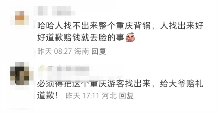 同时,IP地址为重庆的网友也没“护短”,要求那位女游客主动站出来解决问题,“作为重庆人,很抱歉这家重庆人丢人现眼,支持向她追责”“没见过这么奇葩的事,官方能不能主动找那个人让她赔钱道歉”“抓出来让她把钱还给大爷”“把这个人找出来,欠债就得还钱”。