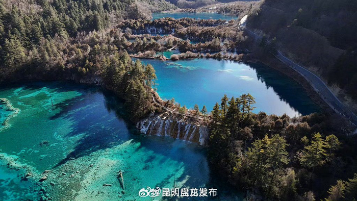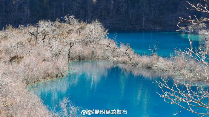 冬日九寨沟如翡翠钻石般惊艳1月11日,四川阿坝州,九寨沟冬日白雪点缀林海,山色与碧水相映,钙华池呈现高饱和度的蓝色和绿色,风景如画↓↓ (@人民日报 )