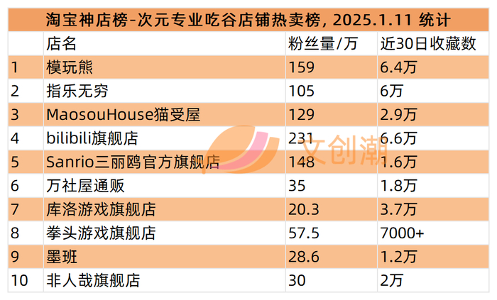 本周统计到的淘宝神店榜-次元专业吃谷店铺热卖榜,前五是: