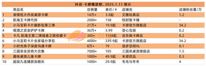 文创潮本周统计到的抖音卡牌爆款榜,前五名分别是: