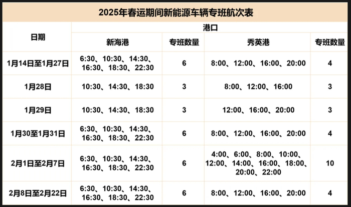 目前距离2025年春运已进入倒计时,为进一步满足琼州海峡新能源车辆过海运输需求,根据当前新能源车辆进出岛需求情况海峡股份于1月14日(春运当天)起调整新能源车辆专班航次。具体如下图:
