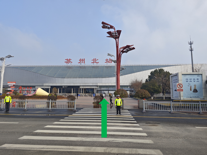 轨交2号线“高铁苏州北站”站下车,通过1号出站口后,直行穿过商业街到达南广场,沿风雨走廊向西到达进站口。