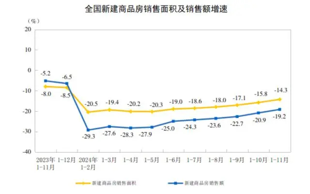 1-11月,新建商品房销售面积8.61亿平方米,同比下降14.3%,其中住宅销售面积下降16.0%。新建商品房销售额8.51万亿元,下降19.2%,其中住宅销售额下降20.0%。