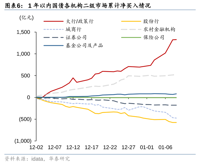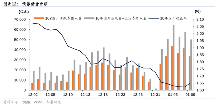 第三,年后短端利率加速回归,带动长端利率调整。年前最后两周,受机构行为等非市场化因素影响,1年国债与国开债利率大幅下行。跨年之后,随着银行指标压力减小、中小行兑现浮盈、央行暂停国债买入,短端利率逐步向常态化回归,也影响了中长端利率。