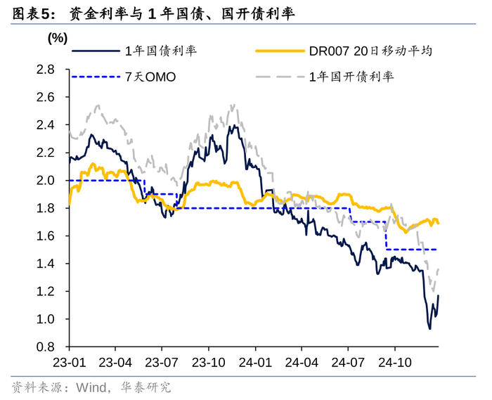 那么上述几大因素是趋势还是扰动?我们倾向于以扰动为主。在货币政策大方向确定的背景下,“适度宽松”、“择机降准降息”、“加大调控强度”仍是今年货币政策的主基调,且当前融资需求弱+高实际利率的现实本就支持央行降息,区别只是在于何时落地和幅度。此外,长债利率管控似乎不是真正的利空因素。从政策本意看,央行更多可能希望利率不要过快下行,但市场前期快速抢跑,蕴含了一定风险,有必要出手降温。我们认为在国债供给大规模到来之前(经验上是3月两会之后),央行可能会持续暂停购债,取而代之可能是降准,节前资金面大概率会维持平稳。春节前债市持续处在基本面、国内政策的真空期,利率预计维持低位震荡,真正的波动预计要等到节后。