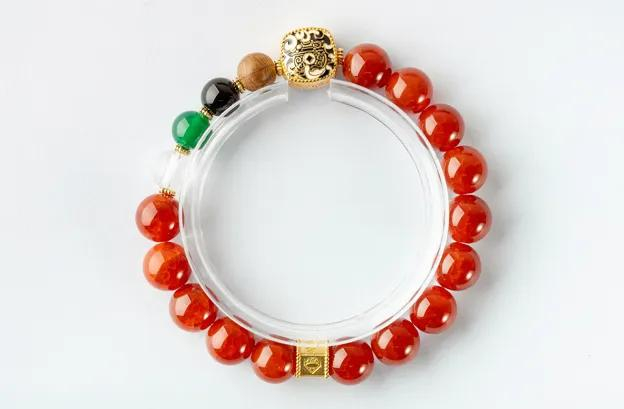 手串以红色为主体,搭配白、绿、黑、黄、金五色,不同材质的珠子搭配成:
