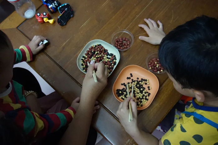 晚饭后,惠萍会送两个大孩子上辅导班,福利院有专门的老师辅导孩子完成作业。在这个间隙,惠萍要像接力赛一样给孩子洗澡,以及让其中一个孩子“夹豆豆”——把一个盘子里的黄豆、黑豆和花生用筷子分别夹出来。这个孩子有多动症,医生建议他借助训练慢慢安静下来,不然入睡很困难。