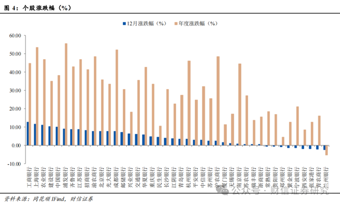 12月,A股42家银行中,33家录得上涨,9家下跌,其中工商银行领涨,月涨跌幅12.52%。细分类下,国有大行平均涨幅最大,月平均涨跌幅为9.47%,工商银行(12.52%)涨幅最大;全国性股份行排名第2位,月平均涨跌幅为5.18%,其中浦发银行(8.77%)涨幅最大;城商行涨跌幅排名第3位,月平均涨跌幅为3.32%,其中上海银行(11.59%)涨幅最大;农商行排名相对靠后,月平均涨跌幅为0.8%,其中渝农商行(7.65%)涨幅最大。
