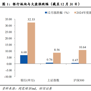 12月,申万银行录得涨跌幅6.68%,跑赢上证指数5.92pct.,跑赢沪深300指数6.21pct.,月涨跌幅在申万31个一级行业中排名第1位。