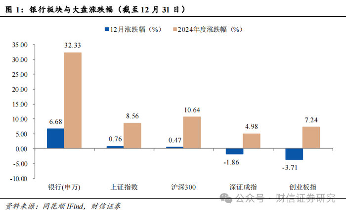 12月,申万银行录得涨跌幅6.68%,跑赢上证指数5.92pct.,跑赢沪深300指数6.21pct.,月涨跌幅在申万31个一级行业中排名第1位。其中,工商银行领涨(+12.52%)。