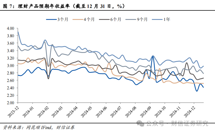 理财产品预期年收益率下行。环比来看,除4个月期理财产品收益率持平外,其余期限理财产品收益率均下降,其中3个月、1年期收益率环比均下降16BP,降幅最大。同比来看,所有期限理财预期收益率均下降,其中1年、4个月期收益率降幅最大,分别下降63BP、57BP。