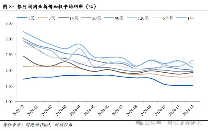 同业拆借利率环比涨跌互现。12月份,同业拆借加权平均利率为1.57%,环比上升1BP,同比下降21BP。环比来看,同业拆借利率涨跌互现,其中120天期利率上升19BP,涨幅最大,1年期利率下降22BP,降幅最大。同比来看,所有期限利率均下降,其中1年、6个月期限利率同比降幅最大,分别下降了1.16、1.05pct.。