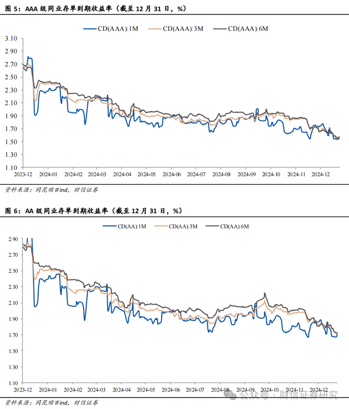 同业存单到期收益率下行。AAA级1M/3M/8M同业存单到期收益率分别为1.55%、1.60%、1.59%,较11月末分别下降了-5BP/-20BP/-21BP。AA级1M/3M/8M同业存单到期收益率分别为1.68%、1.78%、1.79%,较11月末分别下降了-3BP/-17BP/-18BP。