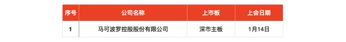 深交所上市审核委员会定于2025年1月14日召开2025年第1次上市审核委员会审议会议,届时将审议马可波罗控股股份有限公司(简称“马可波罗”)的首发事项。