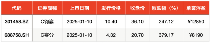 1月10日,钧崴电子在创业板上市,发行价格10.40元/股。截至上市首日收盘,钧崴电子报36.10元,上涨247.12%。以收盘价计算,投资者中一签浮盈为12850元。