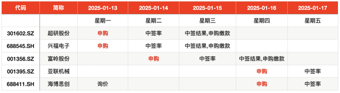 兴福电子、超研股份均在本周一开启申购,富岭股份在本周二申购,海博思创、亚联机械则在周四申购。
