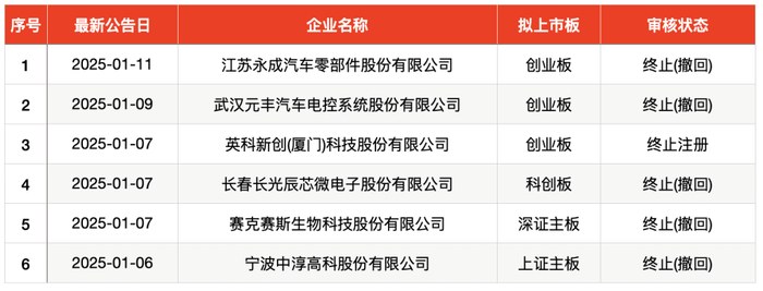 上周共有6家企业终止IPO,江苏永成汽车零部件股份有限公司、武汉元丰汽车电控系统股份有限公司、长春长光辰芯微电子股份有限公司、赛克赛斯生物科技股份有限公司、宁波中淳高科股份有限公司主动撤回了IPO申请,英科新创(厦门)科技股份有限公司为终止注册。