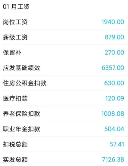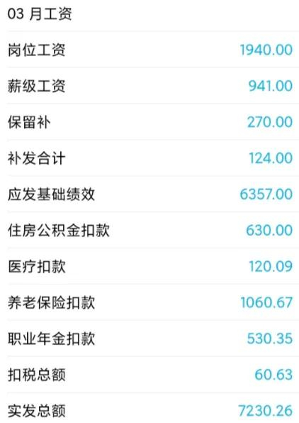 如图所示,这是2023年1-3月份的工资待遇情况:每月到手工资7200左右,公积金单边只有630元。年底发绩效,但听说学校紧张,就先发了1W,给大家过年用。