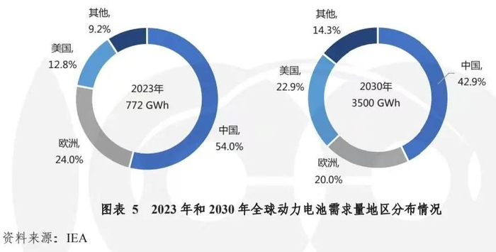 全球动力电池的需求主要来自于中国、欧洲、美国等国家或地区,集中趋势明显。在政策驱动和市场体量的共同作用下,中国、欧洲、美国是当前全球新能源汽车和动力电池的主要消费市场。据IEA数据显示,2023年全球动力电池需求量超过750GWh,其中中国、欧洲、美国的市场占比分别为54%、24%、13%;在既定政策情境下,预计到2030年,全球动力需求量将达3500GWh左右,其中中国、欧洲、美国的市场占比分别约为43%、20%、23%。