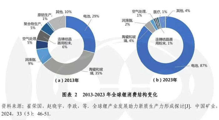 在新能源汽车产业的发展带动下,动力电池已成为推动锂、钴、镍资源消费增长的主要动力。相关数据显示,在全球锂、钴、镍资源消费结构中,电池用锂消费占比从2013年的29%激增至2023年的87%,电池用钴消费占比从2011年的36%增长至2020年的69%,电池用镍消费占比从2020年的8%增长至2022年的16%。