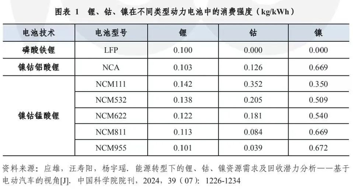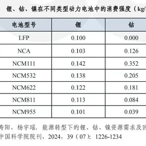 在不同种类的动力电池中,锂、钴、镍的消费强度有所不同。锂的消费强度相对稳定,通常在0.10kg/kWh至0.15kg/kWh之间浮动;钴和镍的消费强度则随着三元电池技术的迭代不断变化,如NCM(镍钴锰酸锂)-955是一种典型的低钴高镍电池,其钴和镍的消费强度分别为0.04kg/kWh和0.67kg/kWh。