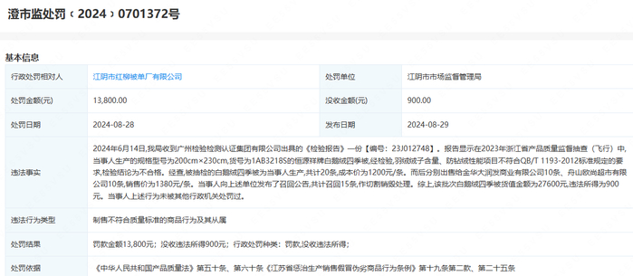 企查查显示,2024年6月,江阴市红柳被单厂有限公司被江阴市市场监督管理局罚款13800元,没收违法所得900元。原因是在质量监督抽查中,恒源祥牌白鹅绒四季被的绒子含量、防钻绒性能项目不符合QB/T 1193-2012标准规定的要求。