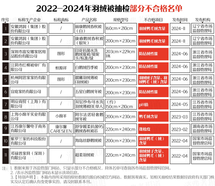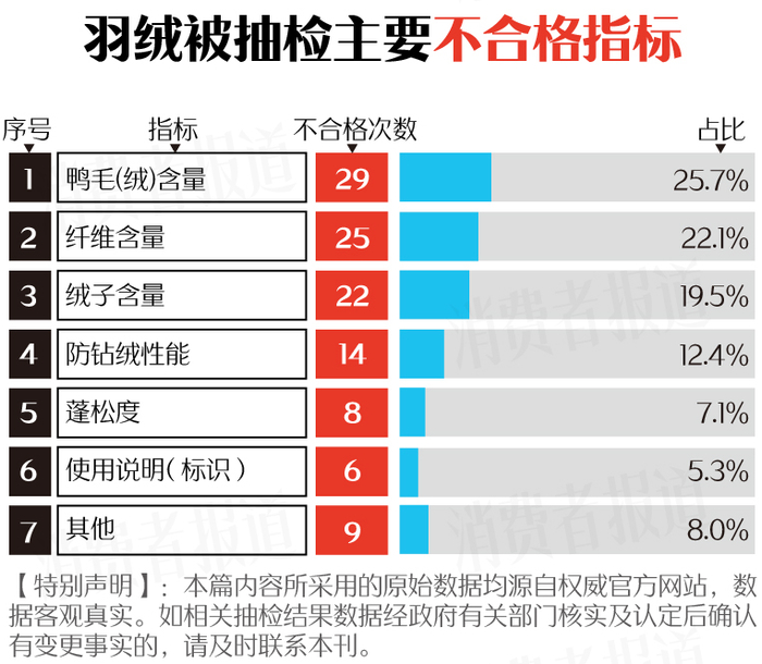在不合格的产品中,富安娜、恒源祥、邓禄普、小绵羊等品牌上榜,不合格项目主要为鸭毛(绒)含量、纤维含量、绒子含量、防钻绒性能等。