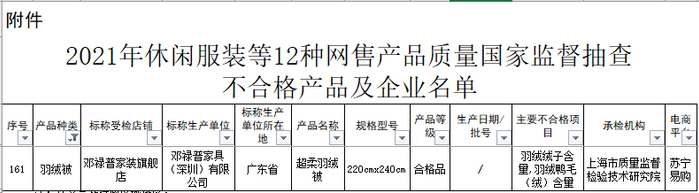 通报显示,1批次标称由“邓禄普家具(深圳)有限公司”生产的超柔羽绒被检出不合格,受检店铺为“邓禄普家装旗舰店”,不合格项目是羽绒绒子含量、羽绒鸭毛(绒)含量。