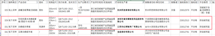 另外,在此次抽检中,1批次标称由“江阴市红柳被单厂有限公司”生产的商标为“恒源祥”白鹅绒四季被(200cm×230cm)也被抽检发现不合格,销售单位为“金华大润发商业有限公司”,不合格项目为防钻绒性能。