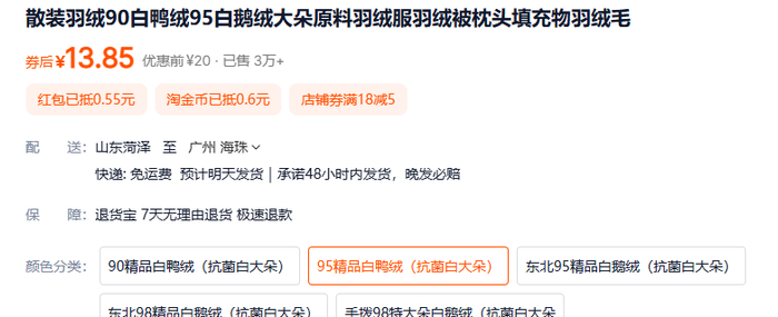为了深入了解羽绒价格及市场情况,《消费者报道》记者在电商平台搜索羽绒原料价格发现,在一家销量上万的店铺中,其标注为“95精品白鸭绒”的产品价格为13.85元/50g,而标注为“东北95精品白鹅绒”的产品价格为17.73元/50g。