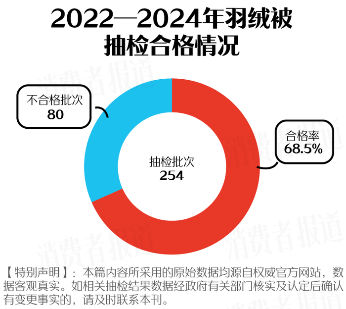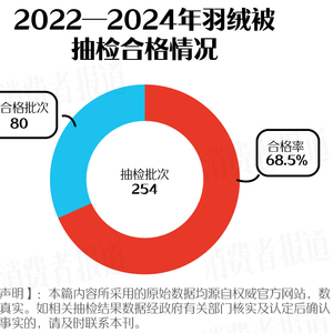 据《消费者报道》统计,近三年来(2022年1月—2024年12月),国家市场监督管理总局及各省市级市场监督管理局共抽检254批次羽绒被,其中80批次不合格,整体合格率约为68.5%。