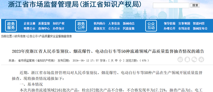 2024年6月,浙江省市场监督管理局发布2023年度浙江省人民币鉴别仪、烟花爆竹、电动自行车等50种流通领域产品质量监督抽查情况的通告。