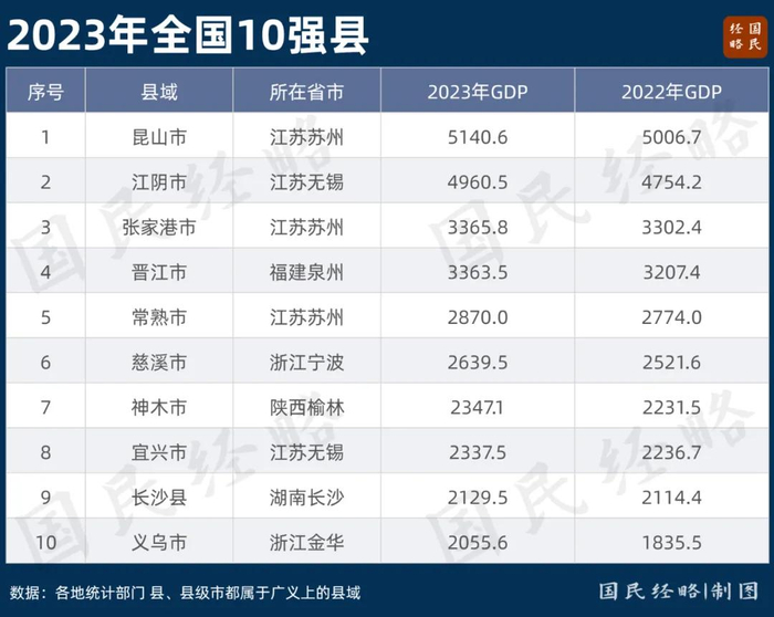 我国GDP10强县格局基本稳定:昆山、江阴、张家港、晋江、常熟、慈溪、神木、宜兴、长沙县、义乌。