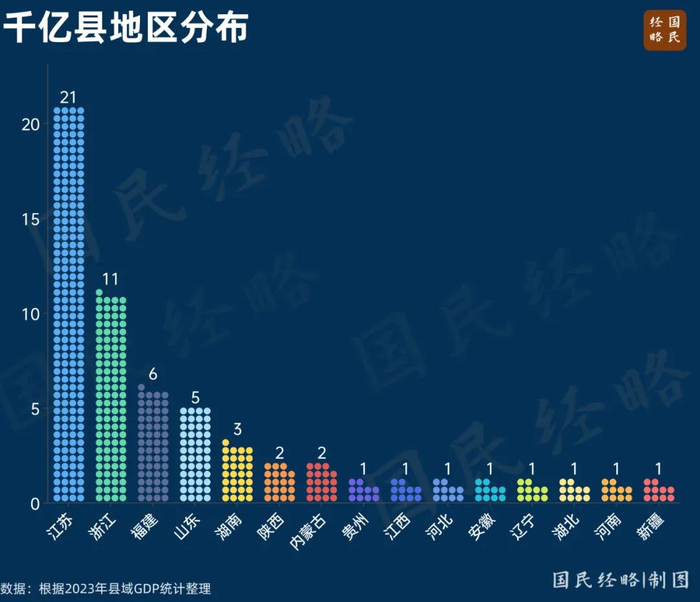 其中江苏多达21县,浙江11席,福建6席,山东5席。可以说,全国最富的省份,正在批量制造“千亿县”。