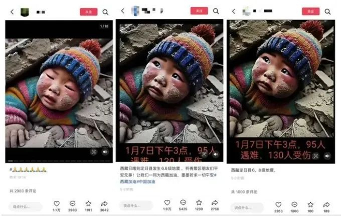 比如下面这张图片:一个戴帽子的小孩被重压在倒塌的建筑物下,在某短视频平台上,至少有10个以上的账号发布,并和西藏日喀则地震关联,有些甚至获得好几万的转评赞。
