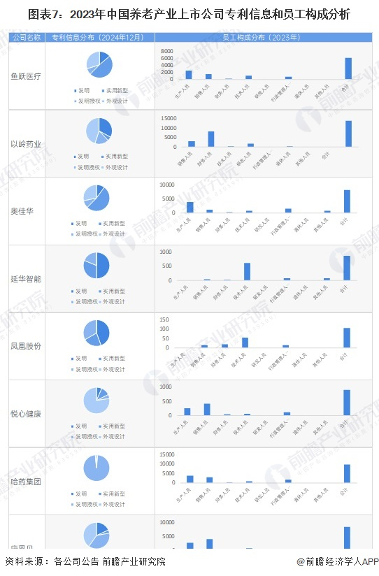 从养老产业的上市企业已有的公开信息分析,专利信息相对较多的企业是哈药股份,其中发明专利超过1700条;员工总数最多的是以岭药业,2022年员工总数为15115人。