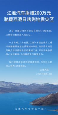 1月7日,西藏日喀则市定日县发生了6.8级强烈地震。这一自然灾害发生后,江淮汽车迅速启动应急响应机制,团结全体员工,通过安徽省慈善总会向受灾地区捐赠现金200万元,用于受灾群众的紧急救助及灾后重建工作,帮助灾区民众渡过难关。