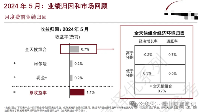 这只产品的投资标的为中国股票、债券和大宗商品及其衍生品,核心策略在于全天候策略+主动择时。2024年9月份之前,黄金起了很大作用;9月20日之后,A股权益资产为产品带来巨大收益;全年是中债牛市,也是产品的重要收益来源。
