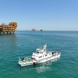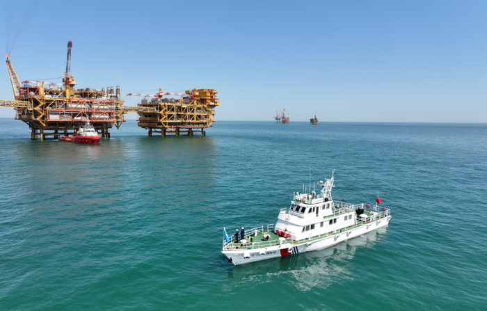 “海巡 03001”轮对大连辖区石油钻井平台进行巡视。
