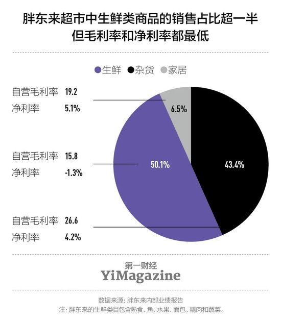 内部报告还显示,胖东来超市的确奉行了大生鲜战略,其生鲜类商品的销售额占比超过一半。不过,生鲜在胖东来三大品类中的毛利率也最低,且处于净亏损状态。与之相比,胖东来的自有品牌产品在2023年合计销售额达到2.5亿元,同比增长313.4%,占门店自营总销售的6.1%,平均毛利率高达24.1%。