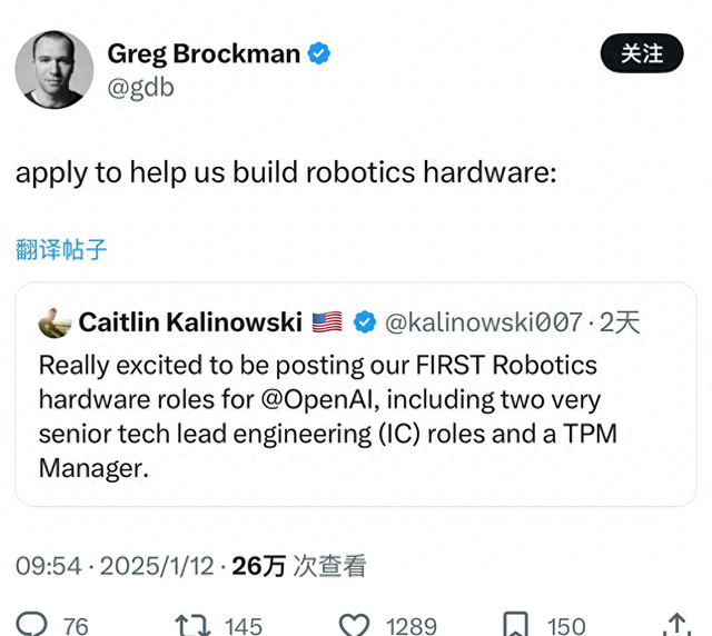 OpenAI联合创始人兼总裁Greg Brockman发布的帖子