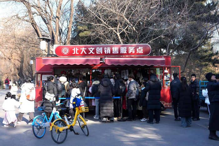 1月13日起,北京大学开放2025年寒假校园参观,近一周的参观名额已被一抢而空。北大在校园里开设了多处官方文创售卖点。精美的文创产品吸引了大批游客排队选购,成为了打卡热门景观的“标配”。