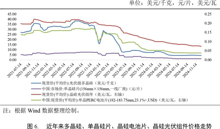 多晶硅是一种重要的半导体材料,主要用于制作太阳能电池、半导体器件等。在2022年多晶硅价格高位运行刺激下,供给端厂商进一步扩大产能,使得供应大幅增加,2023年多晶硅价格总体进入波动下行周期。2024年供过于求的矛盾更趋突出,多晶硅价格持续探底。7月,工业和信息化部发布《光伏制造行业规范公告管理办法(2024年本)》(征求意见稿)以加强光伏制造行业管理,引导产业加快转型升级、实现高质量发展。随后多晶硅价格引来一波小幅反弹,但11月起又开始小幅下探。与多晶硅扩产导致的供需失衡类似,双碳政策推动下光伏装机容量需求猛增,前期硅片企业大量新增产能,扩大硅片供给并导致产能过剩,2023年以来硅片价格整体处于波动下行周期。根据工业和信息化部数据,2023年多晶硅价格跌幅超50%。根据中国光伏行业协会数据,2024年1-10月多晶硅价格下跌超35%,硅片价格下跌超45%,光伏前端制造商经营承压明显。虽然原材料的下跌在一定程度上缓解了光伏终端制造商的成本压力,但行业“内卷式”竞争同样导致电池片、光伏组件等终端产品价格同步下跌。根据工业和信息化部数据,2023年组件产品价格降幅超50%;根据中国光伏行业协会数据,2024年1-10月电池片、组件价格下滑超25%,但跌幅小于多晶硅、硅片等原材料。