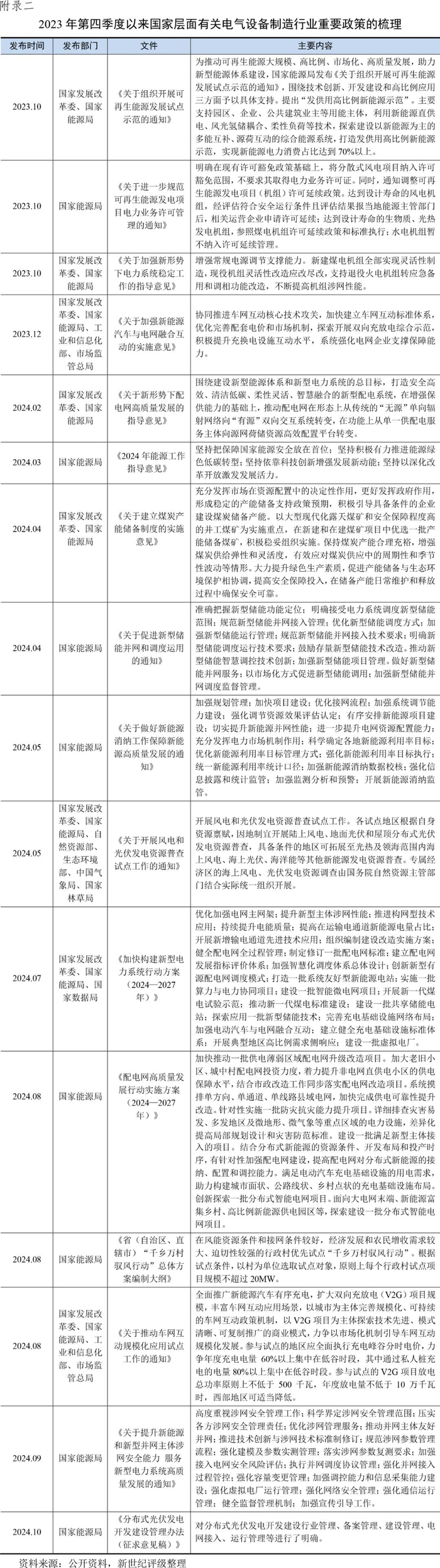 展望2025年,国家不断推进煤电项目的核准及煤电容量电价机制,以发挥煤电的兜底保供作用及调节性电源作用,预计火电建设投资规模及新增装机容量仍有一定增长空间。在双碳目标下,国家对新能源建设的政策支持以及风光基地建设的持续推进,仍可对风电装机需求形成支撑。受益于我国新能源装备产业链完整且竞争力强,全球能源结构低碳转型趋势下海外装机需求亦对国内风电设备产业形成利好。特高压建设、配电网改造以及农村电网巩固提升的相关投资可为电线电缆及变压器市场需求提供支撑,但中低端产品进入壁垒较低,价格竞争充分,相关企业竞争压力较大。在相关配套政策实施,叠加新能源并网、发电侧新能源消纳市场需求提升等背景下,预计我国储能锂电池市场将进一步扩大,龙头企业的国际竞争地位也有望进一步提高。光伏产业链竞争失序,阶段性供需失衡矛盾突出,内卷式竞争问题亟待解决,相关约束机制的具体效果仍有待观察。中短期内,预计我国电气设备制造行业内各细分领域的领头企业市场地位将持续得到巩固,新能源相关电气设备领域龙头企业的资本支出及生产设施全球化布局力度将加大,并推动行业整体规模扩张;传统电气设备领域竞争压力将进一步增大,但龙头企业仍面临着通过技术升级和产品结构调整优化以实现高质量发展的机遇。