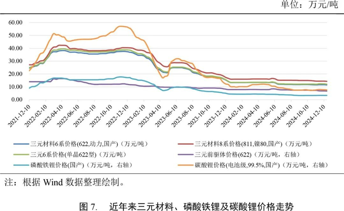 三元材料[7]、碳酸锂以及磷酸铁锂等锂盐化合物作为原材料主要应用在新能源汽车、电动自行车、电动工具、储能设备等产品的制造与生产中。由于下游新能源车的需求大幅增长,同时上游矿石开采存在一定滞后,电池级碳酸锂曾一度供不应求。但2023年以来,随着原材料产能逐步释放,需求增速放缓,供需反转导致锂价快速回落。截至2023年12月31日,工业级碳酸锂国内混合均价为9.40万元/吨,与1月1日均价50.40万元/吨相比下降了81.35%;12月31日电池级碳酸锂国内混合均价为10.30万元/吨,与1月1日均价52.50万元/吨相比下降了80.38%。2024年锂价整体进一步震荡下行,截至12月19日,国内工业级碳酸锂价格为7.74万元/吨,国内电池级碳酸锂价格为7.98万元/吨。锂价下行在短期内有助于电池生产商缓解成本压力。