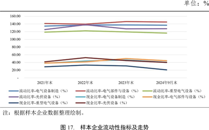 2024年9月末,电气设备行业样本企业流动比率为136.79%,较上年末下降0.73个百分点,总体变化不大。其中,重型电气设备、光伏设备、电线电缆、变电设备、电气仪器仪表、储能设备样本企业分别为116.20%、127.73%、152.97%、150.20%、165.55%和144.02%。由于样本企业流动资产中存货和应收账款占比较高,行业实际流动性一般。同期末,电气设备行业样本企业现金比率为40.59%,较上年末下降5.92个百分点。其中,重型电气设备、光伏设备、电线电缆、变电设备、电气仪器仪表、储能设备样本企业分别为20.68%、39.95%、26.46%、31.52%、49.89%和66.73%。