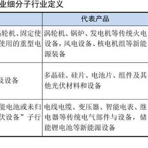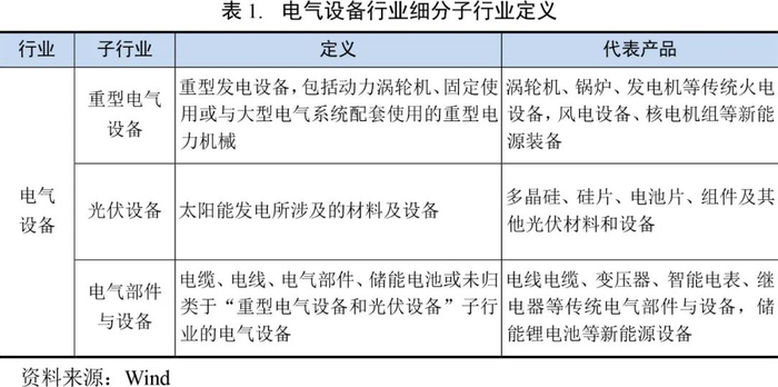 根据Wind行业分类标准,电气设备行业可进一步细分为重型电气设备、光伏设备以及电气部件与设备三个子行业。其中,重型电气设备主要为风电设备,以及火电设备、核电设备等其他发电设备;光伏设备主要为太阳能发电所涉及的各种材料、电池以及组件等;电气部件与设备主要包括电线电缆、变电设备、电气仪器仪表等输配电设备和储能设备。