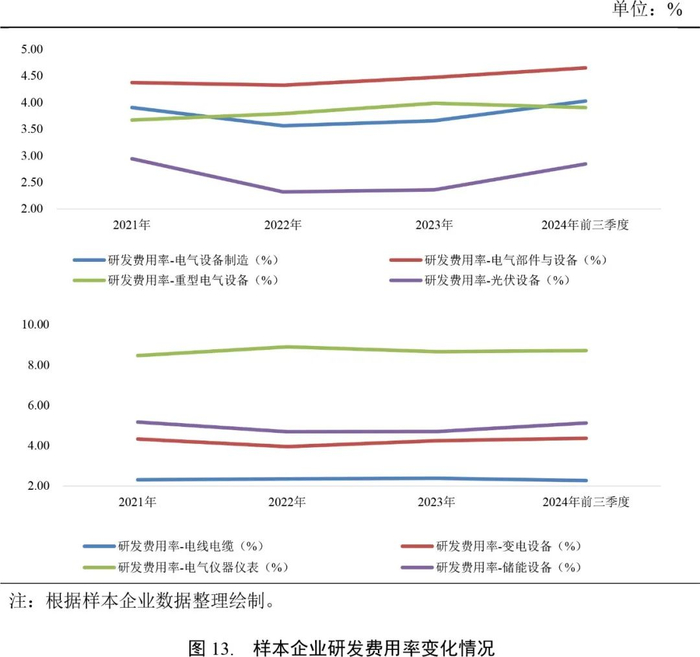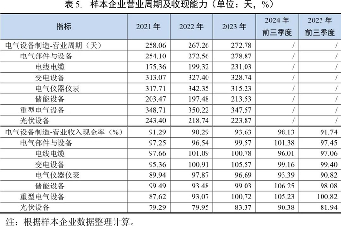 2023年及2024年前三季度,主要受光伏设备企业无序竞争及储能设备企业库存管理因锂价持续下行而承压等因素影响,电气设备行业样本企业收入增速同比明显回落。当期行业整体综合毛利率水平较上年变化不大,但是光伏设备样本企业综合毛利率下降较多。研发能力是电气设备制造企业的核心能力,近年来行业研发费用保持增长,但占营业收入的比重仍偏低。电气设备行业对上下游议价能力均偏弱,应收账款和存货占款规模大,营业周期偏长。