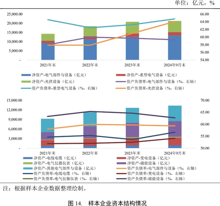 资产方面,2024年9月末,电气设备行业样本企业资产合计55,034.04亿元,较上年末增长4.44%;其中重型电气设备、电线电缆和变电设备样本企业资产增长相对较快,分别较上年末增长7.65%、9.98%和6.70%。资产结构方面,当期末电气设备行业样本企业流动资产合计占总资产的比重为58.93%,较上年末下降0.90个百分点,其中电线电缆和储能设备样本企业流动资产合计占比相对较高,分别为73.96%和65.24%,光伏设备样本企业相对较低,当期末为53.61%。由于电气设备行业处于产业链中端,对上下游议价能力偏弱,大量资产沉淀于存货和应收账款。2024年9月末,电气设备行业样本企业存货和应收账款合计分别为7,182.56亿元和7,983.24亿元,分别较上年末增长9.28%和11.00%,存货和应收账款合计占总资产的比重分别为13.05%和14.51%。其中,电线电缆样本企业存货和应收账款合计占总资产比重达49.00%,资金沉淀最为严重,储能设备样本企业当期末占比为20.97%,相对较小。