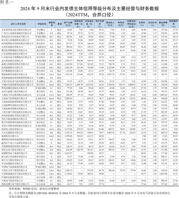 电气设备行业的发债主体主要为从事电机制造、电气机械及器材制造、输配电及控制设备制造、电线电缆制造、储能锂电池制造等大中型企业。从行业内已发债企业来看,发债企业主要为各细分领域龙头企业,且以民营企业居多,涵盖主体信用等级从A级至AAA级的发行人,整体信用等级集中在AAA和AA级。2024年前三季度,电气设备行业公开发行债券主体为15家,发债主体信用级别主要分布在AA+及以上级别。截至2024年9月末,电气设备行业存续的公开发行债券主体共计46家,其中AAA级主体10家,AA+级主体6家,AA级主体11家,AA-级主体8家,A+级主体8家,A级主体3家。2024年前三季度,行业内共1家发行人涉及主体级别调整。